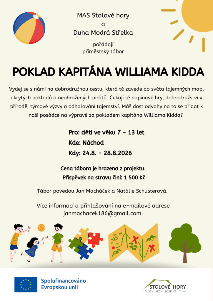 Náš klasický pobytový tábor samozřejmě zůstává, ale letos jsme se rozhodli přidat ještě jedno velké dobrodružství přímo v Náchodě. Na konci prázdnin vyplouváme hledat Poklad kapitána Williama Kidda!